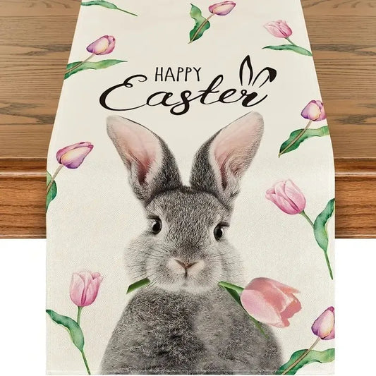 Cute Easter Bunny Table Runner Peach Blossom Seasonal Spring Dining Table Decoration For Easter Theme Gathering Dinner Party